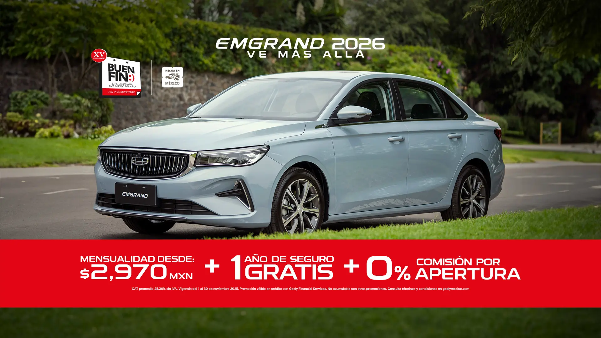 La mensualidad desde $2,970.00 MXN aplica únicamente con el plan de crédito simple, a través de Geely Financial Services (BBVA México S.A., Institución de Banca Múltiple), para el modelo Emgrand 2025 en su versión GC, con un enganche desde 55.10%, sobre un importe promedio a financiar de $123,470.51 MXN. Utilizando el Bono de $25,000 a precio a un plazo promedio de 72 meses y tasa de interés ordinaria fija anual sin IVA del 15.99%. Esta oferta no incluye el costo del seguro, mismo que podrá ser cubierto de contado o financiado, conforme a lo estipulado en su contrato, y no es acumulable con otras promociones. Monto de la mensualidad publicada incluye IVA e impuestos. Aplica 2.5% de comisión por apertura en plan BASE o 0% Comision por apertura utilizando el plan BUEN FIN.