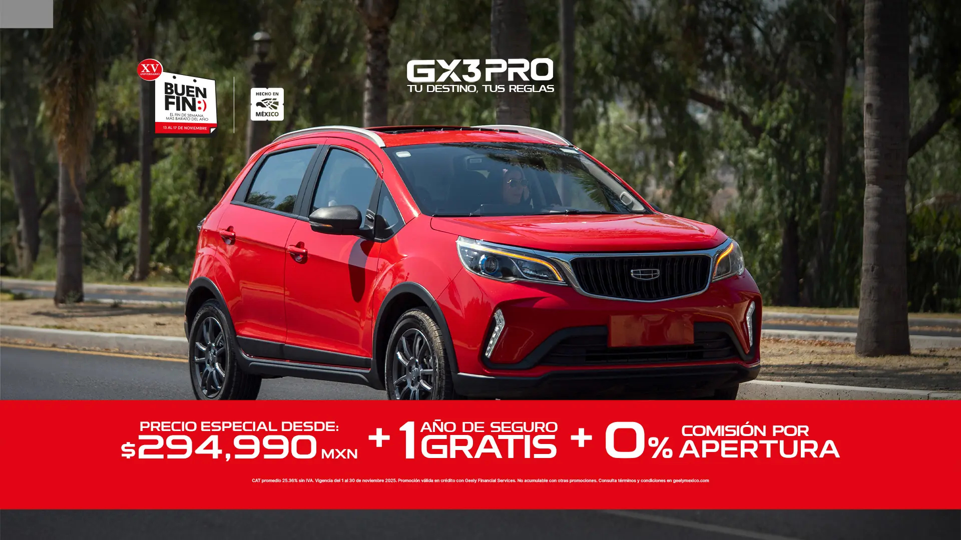 El precio de $294,990 MXN aplica al utilizar el Nuevo Bono Full con el plan de crédito simple, únicamente a través de Geely Financial Services (BBVA México S.A., Institución de Banca Múltiple), para el modelo GX3 Pro 2025 en su versión GC, sobre un precio de $329,990 MXN El Nuevo Bono Full a precio de $35,000 MXN (IVA Incluido no aplica seguro por un año gratis, y no es acumulable con otras promociones. Aplica 2.5% de comisión por apertura en plan BASE o 0% Comision por apertura utilizando el plan BUEN FIN.