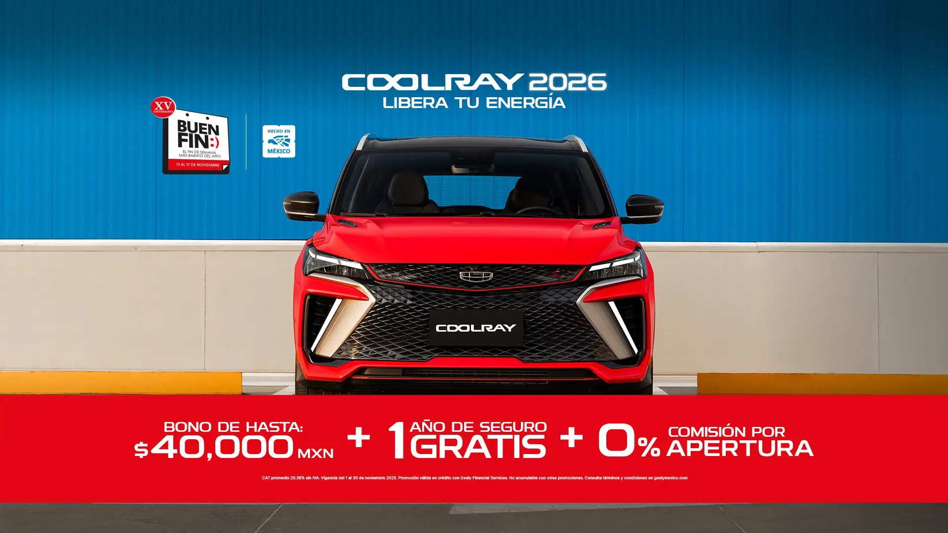 El precio de $387,990 MXN aplica al utilizar el Nuevo Bono Full con el plan de crédito simple, únicamente a través de Geely Financial Services (BBVA México S.A., Institución de Banca Múltiple), para el modelo Coolray 2025 en su versión GC, sobre un precio de $409,990 MXN El Nuevo Bono a precio de $52,000 MXN (IVA Incluido no aplica seguro por un año gratis, y no es acumulable con otras promociones. Aplica 2.5% de comisión por apertura en plan BASE o 0% Comision por apertura utilizando el plan BUEN FIN..