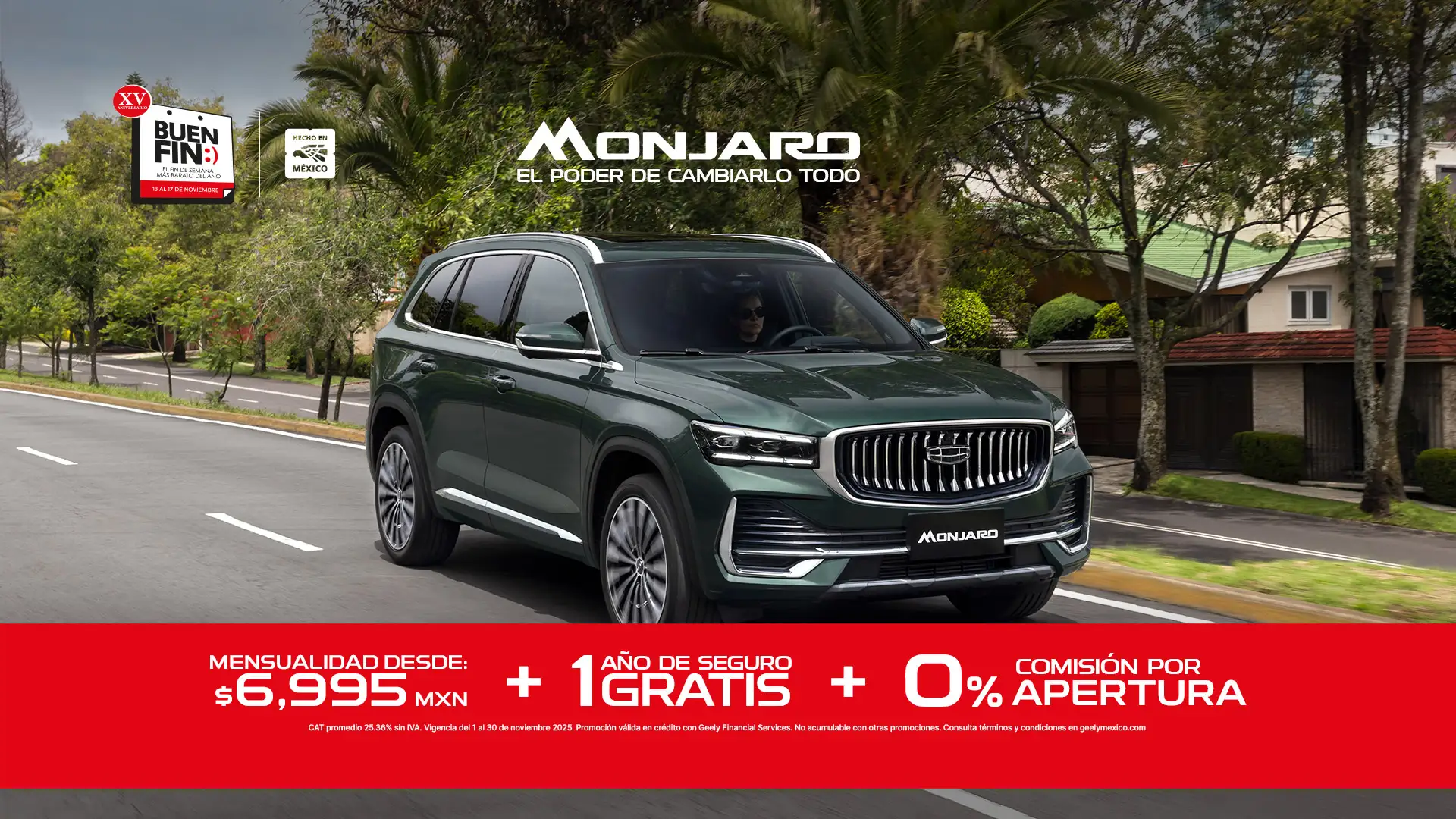 El año de seguro gratis aplica únicamente para el modelo Monjaro 2026 en su versión GF, en operaciones de crédito a través de Geely Financial Services (BBVA). Válido solo con aseguradoras participantes. Consulta especificaciones y condiciones con tu Distribuidor autorizado Geely. Al finalizar el periodo del seguro gratis, el cliente deberá contratar un seguro conforme a lo señalado en su contrato de crédito.